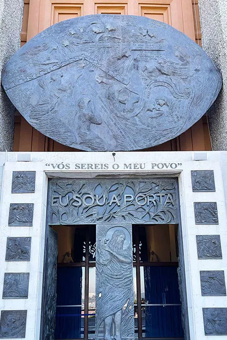 A actual porta do Monumento foi inaugurada a 17 de Maio de 2016. No centro, vê-se a figura de Cristo Bom Pastor, que carrega nas suas mãos a ovelha que necessita de cuidados especiais.