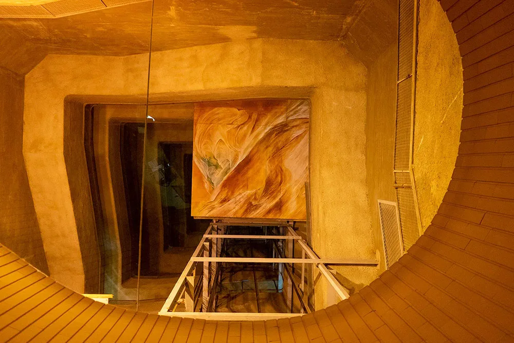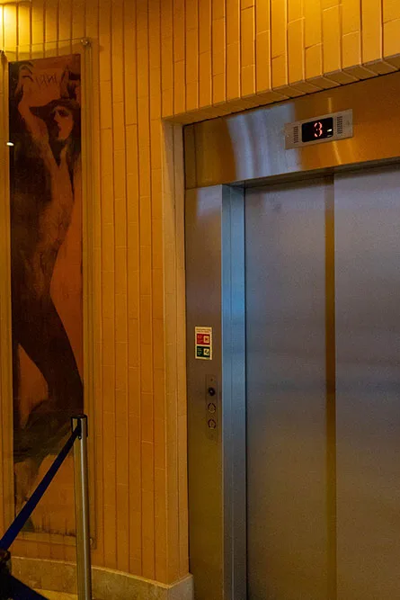 No hall do elevador, através de uma abertura do tecto, pode ver-se o fosso com 80 m de altura, que liga o piso térreo ao terraço superior.