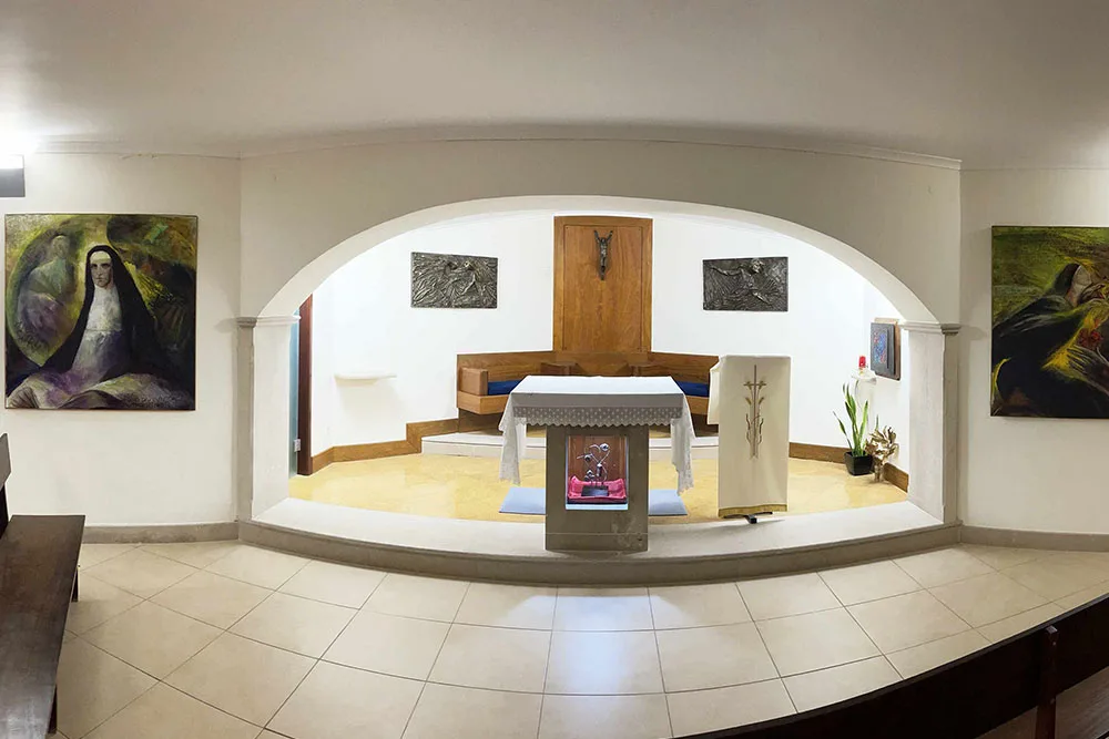 No interior do Edifício de Acolhimento, encontra-se a Capela do Divino Coração de Jesus. Nela, através de três quadros pintados a óleo, fundamentam-se as raízes bíblicas da devoção ao Sagrado Coração de Jesus. Existem treze vitrais, doze dos quais correspondentes às Doze Promessas de Jesus a Santa Margarida Maria Alacoque e um outro alusivo à Beata Maria do Divino Coração (Droeste zu Vichering). No lado direito, está um painel em azulejo, com vinte e sete metros quadrados, que retrata a Adoração Eucarística. Todas estas obras de arte são da autoria do arquitecto Sousa Araújo.