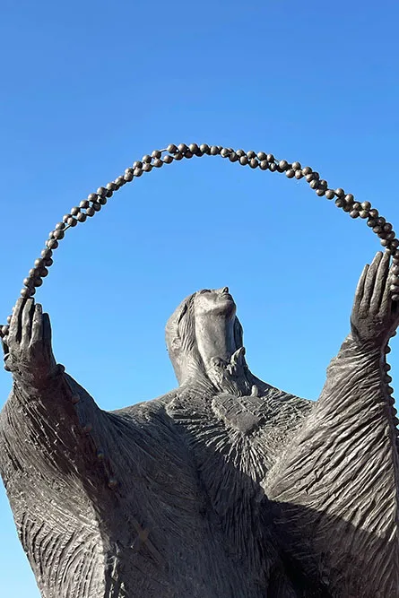 Com o seu olhar terno, convida as outras a entrarem para o seu redil, atitude representada nas esculturas das outras dez ovelhas que se encaminham para dentro do Monumento.