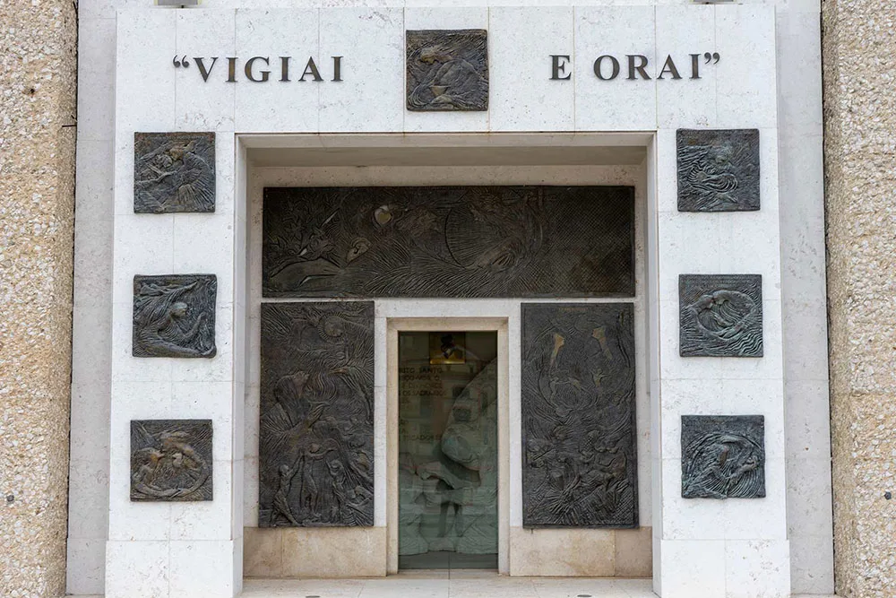 A actual porta do Monumento foi inaugurada a 17 de Maio de 2016. No centro, vê-se a figura de Cristo Bom Pastor, que carrega nas suas mãos a ovelha que necessita de cuidados especiais.